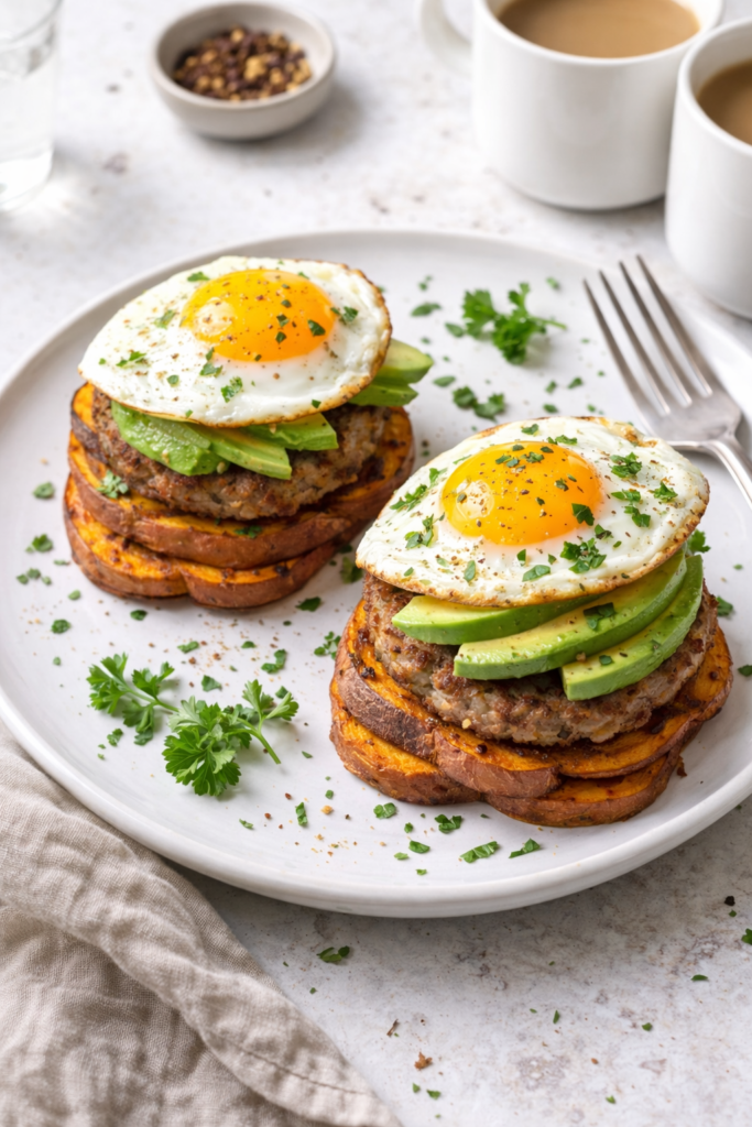 DescriptionThese Paleo breakfast stacks are a hearty and satisfying way to start the day. Layers of crispy sweet potatoes, savory…